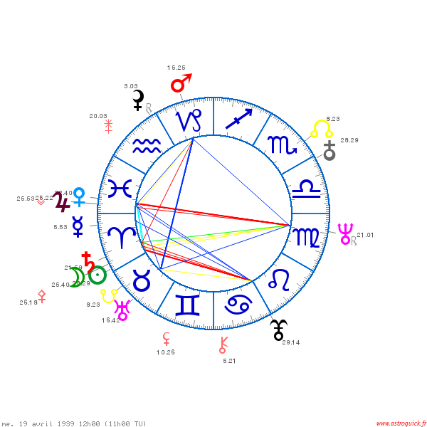 Son Neptune (la religion) est dynamique avec Mars et Uranus. On peut supposer que, si l’on avait son heure de naissance, ce Neptune si religieux serait davantage mis en valeur, sans doute négativement en raison de son intégrisme sanguinaire.