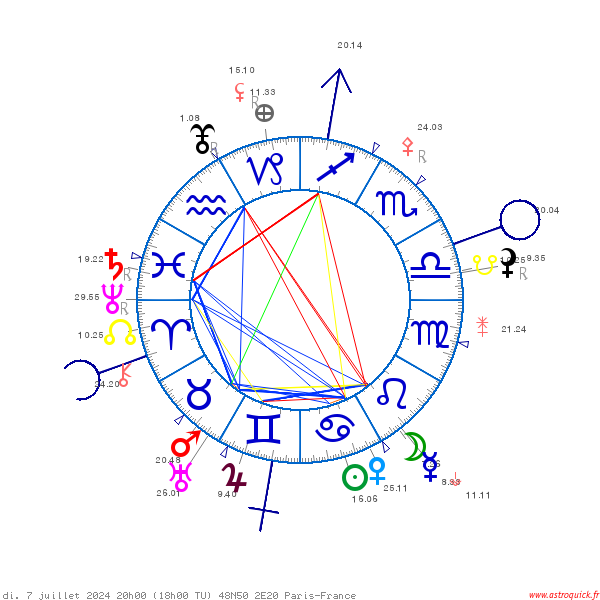 Nous présentons ci-dessous le thème astrologique du second tour législatif du 7 juillet prochain à la fermeture des derniers bureaux de vote à 20h00 à Paris. L’Ascendant de cette carte du ciel se situe pile à 20° du Sagittaire sur le Saturne natal de la constitution de la 5ème République en 1958. Ce Saturne natal représente l’autorité de l’État et le parallèle est vite fait avec un succès plausible d’un parti d’ordre comme le Rassemblement National. Il restera à voir si la probable majorité parlementaire du RN et de ses alliés sera absolue ou seulement relative.