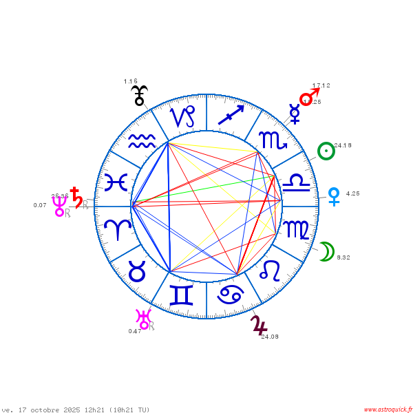 Cette belle relation entre Uranus et Neptune (angle favorable de 60°) est générale et concerne l’ensemble du globe. Certains pays peuvent hélas y échapper ou n’en bénéficier que plus tardivement. Cette influence étalant son influence sur au moins 5 années, il ne faut pas forcément être trop pressés pour en bénéficier immédiatement chez soi…